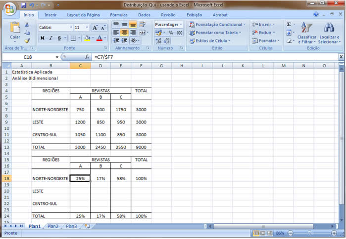 | Essa tabela parece revelar algum grau de dependência/relacionamento entre as variáveis região de residência do leitor e preferência por revista semanal de circulação nacional, uma vez que, se não houvesse, seriam esperadas proporções próximas a 33,33%; 27,22% e 39,44% em cada uma das regiões (de tal modo que não seria possível a identificação da região, caso fosse dado o perfil de preferência, ou, em outras palavras, para todas as regiões valeria o padrão de preferência revelado para o Brasil como um todo). Dito de outra forma, se a distribuição de preferência considerando todas as regiões é 33,33%; 27,22% e 39,44%, então caso a preferência fosse independente da região, encontraríamos essa mesma proporção em todas as regiões. Por exemplo, para a revista A na região Norte-Nordeste, teríamos 33,33% do total da região, ou seja, 33,33% * 3000 = 1000. Para a revista B teríamos 27,22% do total, nesse caso 27,22%*3000 = 817 e, por fim, para a revista C teríamos 39,44% * 3000 = 1183. Assim, as respectivas frequências hipotéticas para essa situação (de independência) seriam:
