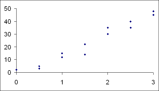 | A fim de se otimizar a equação de regressão, esses parâmetros deverão ter valores que aproximem, ao máximo, a reta dos pontos assinalados no diagrama de dispersão, conforme demonstrado na figura a seguir: