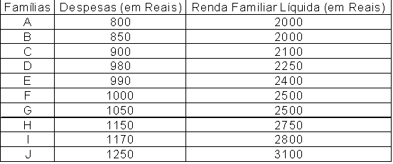Você poderia fazer uma análise descritiva, iniciando pelo cálculo da despesa média, passando pelo cálculo da variabilidade, verificação da existência de pontos discrepantes, mas você está muito intrigado com possíveis explicações para a variação das despesas entre as diferentes famílias, daquela área da cidade. Surge logo uma potencial explicação: a renda das famílias. Como você montou um cadastro, no qual também constam informações sobre a renda familiar (admitindo que as famílias entrevistadas não fizeram nenhuma restrição para informar esse dado), vem a tabela: