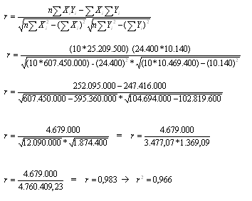 | Com a equação de regressão estabelecida, passaremos, então, à sua validação estatística. Essa validação deve ser efetuada através do cálculo do coeficiente de determinação r². Para tanto calcularemos o coeficiente de correlação entre as variáveis “r” e elevaremos o valor de seu resultado ao quadrado. Assim: