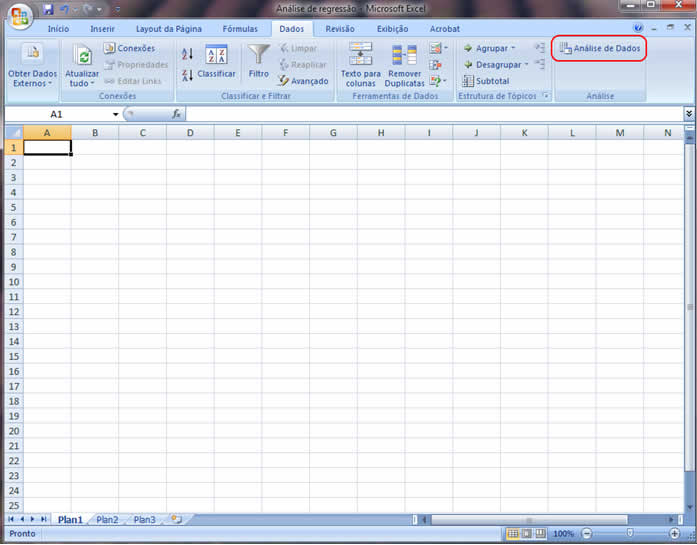 | 1 - Análise de Regressão com o auxílio do Excel Inicialmente devemos verificar se nosso programa Excel está habilitado a executar uma análise de regressão. Para isso devemos clicar, dentro do programa, na guia Dados e verificar se o botão Análise de Dados está disponível:
