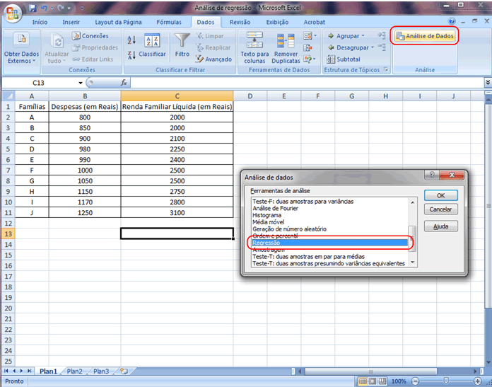 Para a determinação da equação e do coeficiente de determinação deveremos, após digitar os dados na planilha Excel, selecionar uma célula onde queremos que o resultado da análise apareça e depois, na aba Dados, clicar em “Análise de Dados”, selecionar a opção "Regressão" e clicar OK (conforme figura a seguir):