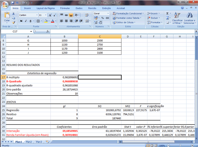 | Essa função, ou seja, a análise de regressão com o auxílio do Excel irá fornecer vários resultados. Alguns destes não são objetos de nosso curso. Dessa maneira poderemos visualizar, em vermelho, os dados de nosso interesse nesse momento: