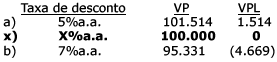 Isto quer dizer o seguinte: Apesar da soma dos valores nominais das prestações ser maior que $ 100.000, quando trazidas a valor presente, pela taxa de desconto mínima exigida pelos sócios/acionistas totalizam aproximadamente $ 95.330, que corresponde a um valor de $ 4.670, menor que o investimento feito. Mas se os sócios/acionistas exigissem taxa mínima de atratividade de 5%a.a. ao invés dos 7%a.a.? Utilizando o mesmo procedimento teríamos: Neste caso, o Valor Presente Líquido seria positivo e os sócios/acionistas teriam um projeto viável em função das suas novas expectativas quanto ao retorno dos seus capitais investidos. Por isso, a definição da taxa mínima requerida pelos sócios/acionistas é tão importante e tão difícil de mensurar. Sua definição, assim como de todos os parâmetros e variáveis envolvidas na análise de investimentos, tais como prazo do projeto, valores de investimento e reinvestimento, receitas e despesas, podem afetar a viabilidade de um projeto. No caso acima, a taxa mínima para que o projeto fosse considerado viável era de 5,472%a.a.. Taxas anteriores deste patamar proporcionam valores presentes líquidos abaixo do valor investido.