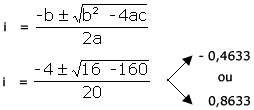 Dessa forma, a alternativa de investimento apresenta duas taxas internas de retorno: uma positiva e outra negativa, explicadas pelas inversões múltiplas de sinais dos fluxos de caixa, cujos resultados são visivelmente conflitantes em termos de decisão. Podem ser encontradas as duas raízes ou, mais precisamente, Taxas Internas de Retorno, também por meio da HP 12C, conforme procedimento abaixo: