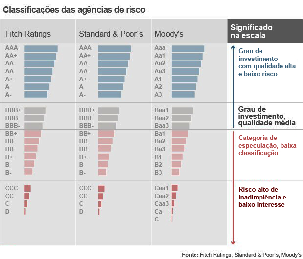 A opinião da agência de rating, depois de acurada perquirição da realidade da empresa, é emitida sob a forma de notas em escalas próprias a cada uma dessas agências, normalmente associando sinais matemáticos (+ e -) e letras (A a D) em que sinais positivos e letras maiúsculas A são associadas a melhores condições de atender aos compromissos financeiros; enquanto sinais negativos e letras D significam alto risco, com amplas possibilidades de inadimplemento.