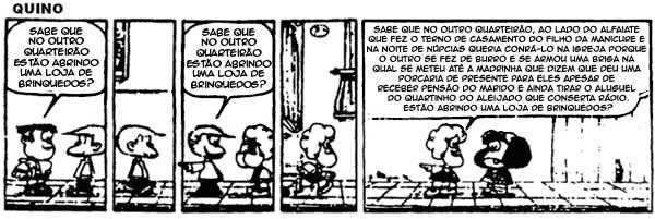 A prolixidade é outro elemento que deve ser evitado. Observe que, no quadrinho (Mafalda, de Quino), Suzanita não consegue ser objetiva e acaba por estender-se ao contar o que ouviu do colega. Ela acaba por falar muito além do essencial, sendo extremamente prolixa.