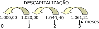Processo inverso ao da capitalização, consiste em mover um determinado valor que ocorrerá em uma data futura, para uma data anterior à sua ocorrência. Para efetuarmos a descapitalização, devemos retirar os juros embutidos no valor futuro (FV), a fim de determinar seu valor presente (PV), conforme demonstrado no fluxo de caixa abaixo: