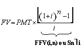 A equação (11) revela que o valor futuro de uma série uniforme postecipada (SUP) pode ser obtido mediante a multiplicação do termo da série (PMT) pelo fator de valor futuro, dada uma taxa “i” e um número de termos “n”, FFV (i,n) ou Snù i, assim, têm-se que: