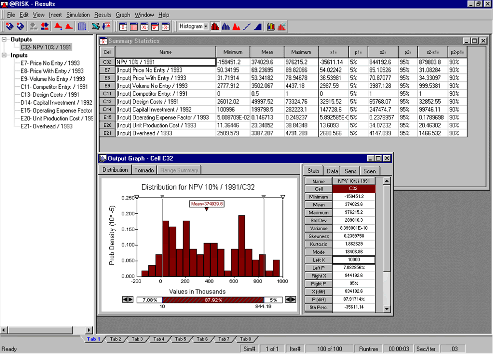 @RISK O @RISK é um software desenvolvido pela PALISADE (http://www.palisade.com) que fornece uma série de ferramentas para que o gerente de projetos possa tomar de melhores decisões associadas aos riscos de projeto. Este software é baseado no método de análise de risco Myriad Risk Analysis, metodologia que permite o desenvolvimento de estratégias de negócios e investimentos, e toma decisões baseadas nas melhores análises, proporcionadas pelo @RISK. O @Risk permite a visualização de todos os resultados possíveis de uma decisão, indicando a probabilidade de cada uma ocorrer. Desta forma pode-se ter à disposição todas as informações necessárias para optar pela melhor alternativa, calculando o risco existente e o que poderá ser evitado.