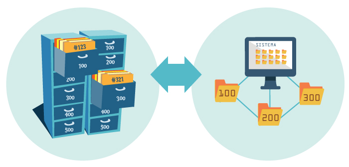 Muito bem, agora vamos fazer uma analogia entre formulários, pastas, gavetas e etc. No exemplo da empresa XYZ, o armário de aço e a caixa metálica constituem arquivos, com função semelhante aos arquivos de dados em uma máquina (computador), sendo que, cada pasta ou ficha constitui um registro, respectivamente, do funcionário ou do material de estoque.