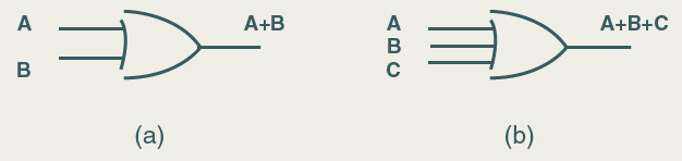 Note, ao observar a figura abaixo, que há duas e três entradas e apenas uma saída. Observe também que deverá haver no mínimo duas entradas, contudo haverá somente uma saída.