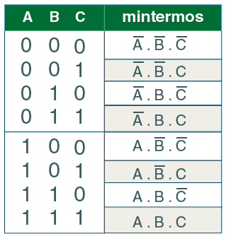 Veja a tabela abaixo, na qual é possível observar os termos de produto associados a cada combinação de entradas para uma função booleana de três variáveis (A, B, C).