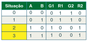 Na situação 3 seria: Quando G1=1 (verde do sinal 1 aceso) quando A = 1 e B = 1 Portanto, G1=1 quando A.B =1