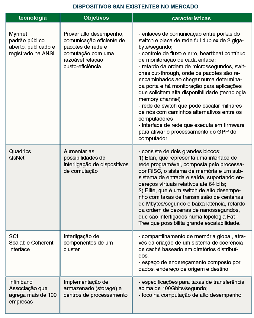 Interconexão de alto desempenho: há inúmeras inovações tecnológicas nos multicomputadores e multiprocessadores, como a interconexão de processadores e memórias de arquiteturas paralelas, usualmente denominada de SAN (system area network), que propiciam ambientes de alta taxa de transferência e baixo retardo, similares aos multicomputadores ou multiprocessadores, utilizando-se de computadores convencionais do tipo PC. Sendo assim os aplicativos podem ser executados, consultando uma grande massa de dados distribuída geograficamente, em supercomputadores dispersos numa rede com recursos já existentes. As principais características que este dispositivo deve dispor é a grande escalabilidade, um serviço de tolerância a falhas, retardo pequeno e a taxa de transmissão da ordem de Gbytes/segundo, além da disponibilidade de um pacote de biblioteca de software de programação para o equipamento. Há dois grupos que realizam essa interconexão: