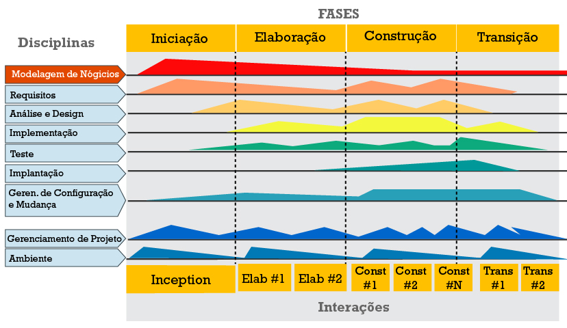 A metodologia RUP é composta por quatro fases e nove disciplinas. As disciplinas são uma coleção de atividades relacionadas a uma determinada área de conhecimento. Dependendo da fase do desenvolvimento em que se está, a interação ocorre com atividades pertencentes a diferentes disciplinas. As fases e disciplinas, bem como o esforço despendido em cada etapa do desenvolvimento RUP, podem ser visualizadas na figura abaixo.