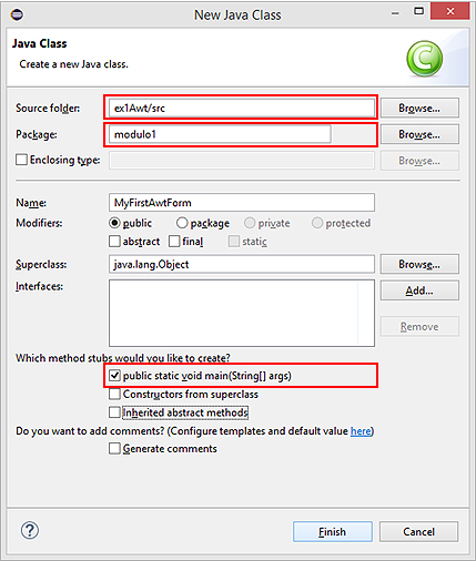 - Na tela New Java Class, em Name, coloque o nome de sua classe que implementará o app: MyFirstAwtForm