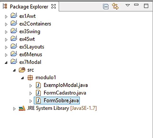 Para organizar, copie todo o projeto ex6Menus em outro projeto ex7Modal, e renomeie a classe ExemploMenu para ExemploModal.