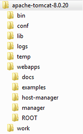 Após o download, descompacte o arquivo zip em uma pasta onde o Apache Tomcat ficará rodando. Se você fez download e descompactou a pasta corretamente, ela deverá ter a seguinte estrutura: