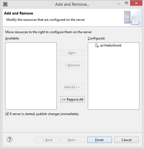 Selecione o ex1HelloWorld e aperte Add para colocar na caixa Configured. E aperte Finish.