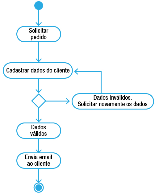 Abaixo, vemos um exemplo de como um diagrama de atividades poderia ser construído para o caso de cadastrar clientes: