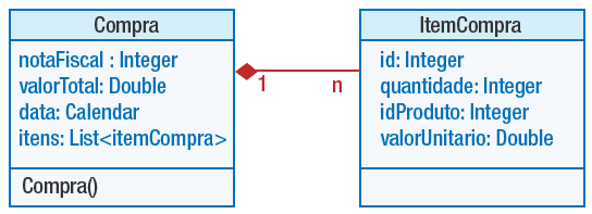 Percebemos claramente que não existe compra sem itens, e vice-versa. Note que o relacionamento é implementado com uma lista de itens na classe Compra.