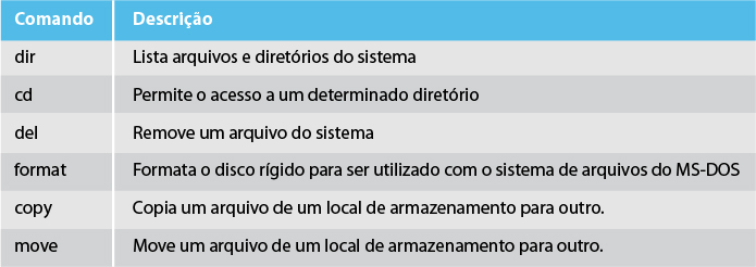 A exibição padrão do MS-DOS para o resultado da execução do comando “dir” trazia, além do nome, o tamanho, a data e hora de criação de cada arquivo. A tabela abaixo lista alguns dos principais comandos utilizados pelos usuários para operar o sistema MS-DOS.
