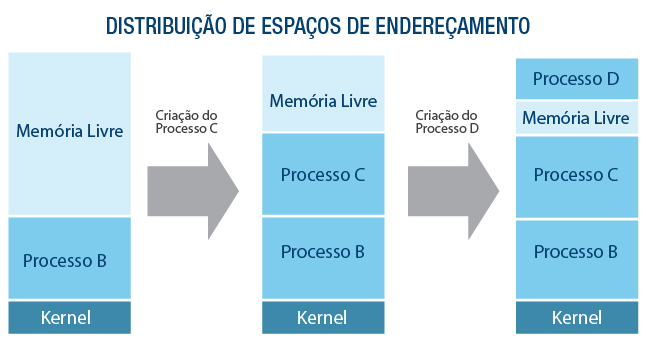 Como já apresentado no módulo passado, ao iniciar um programa, o sistema operacional automaticamente reserva o seu espaço de armazenamento na memória, ou seja, cria uma lista do espaço na memória onde são fornecidas as permissões de leitura e escrita para aquele programa. Neste espaço selecionado são guardados o código do programa que está em execução, os seus dados e a pilha de memória. Com a alocação, o espaço de armazenamento, ou endereçamento, definido para um determinado processo passa a ser de uso exclusivo deste processo, ou seja, o acesso a esta área se torna protegido de forma a impedir que outros processos utilizem este espaço.