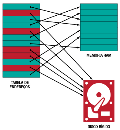 Na prática, o que acontece é que as tabelas de endereçamento do sistema operacional, que normalmente fazem referência a locais de armazenamento na memória principal, passam a direcionar para locais de armazenamento no disco rígido, conforme exibido na figura abaixo.