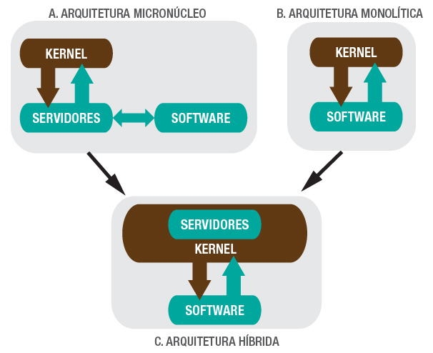 O modelo híbrido é uma tentativa de unir características encontradas nos sistemas monolítico e micronúcleo. O desenho desta arquitetura projeta as funções do sistema operacional em blocos separados, mas sendo executadas por completo dentro do modo kernel do processador. Uma visão esquemática da junção dos modelos é exibida na figura abaixo: