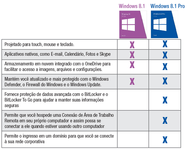 Como esta realidade não é a mesma encontrada nas residências, algumas fornecedoras de sistemas operacionais criaram produtos específicos para cada uma das duas áreas – residencial e corporativa. Um exemplo é a Microsoft que, como já visto, criou o MS Windows 8.1 para uso doméstico e o MS Windows 8.1 “Pro” para uso empresarial. Um breve comparativo destas duas versões é exibido na tabela abaixo.