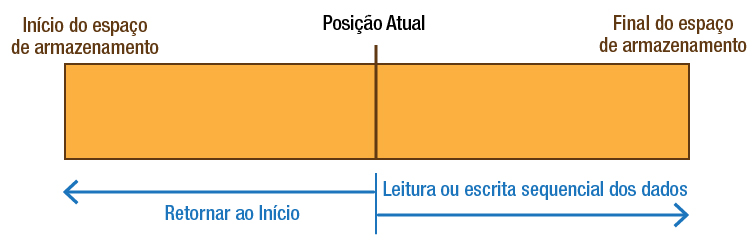 No acesso sequencial, a operação de escrita de novos registros sempre ocorre ao final do arquivo e a operação de leitura sempre ocorre sequencialmente, vinculados à ordem em que os dados foram armazenados. Um desenho esquemático do método de operação é exibido na figura abaixo, o método sequencial é geralmente utilizado na gerência de acesso aos dispositivos de fita magnética.