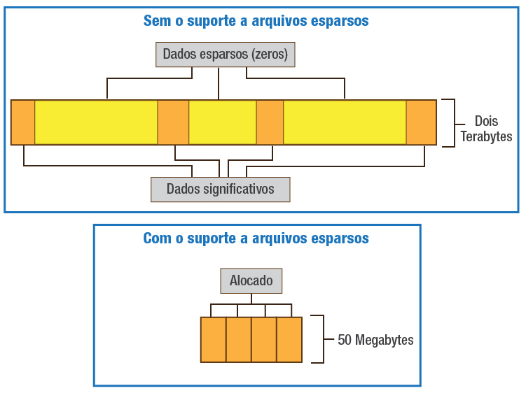 O NTFS5 trouxe, ainda, o suporte a arquivos esparsos, funcionalidade que permite aos programas criar arquivos muito grandes e consumir o espaço em disco apenas quando necessário. Este recurso se dá em função de que muitos arquivos têm a característica de conter áreas que estão momentaneamente sem dados, e que são representadas por longas sequências de zeros, conforme exibido na figura a seguir.
