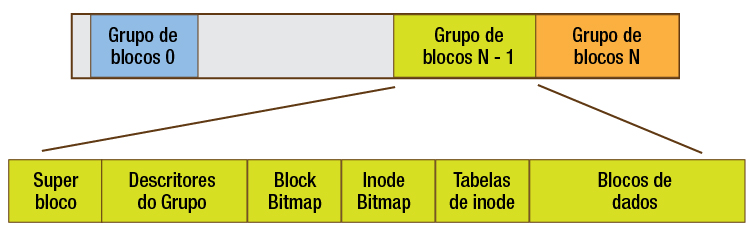 De uma forma geral, o EXT2 divide a área disponível na partição do disco em diversos grupos de blocos que são utilizados para armazenar o conteúdo dos arquivos e os seus metadados, conforme exibido abaixo.