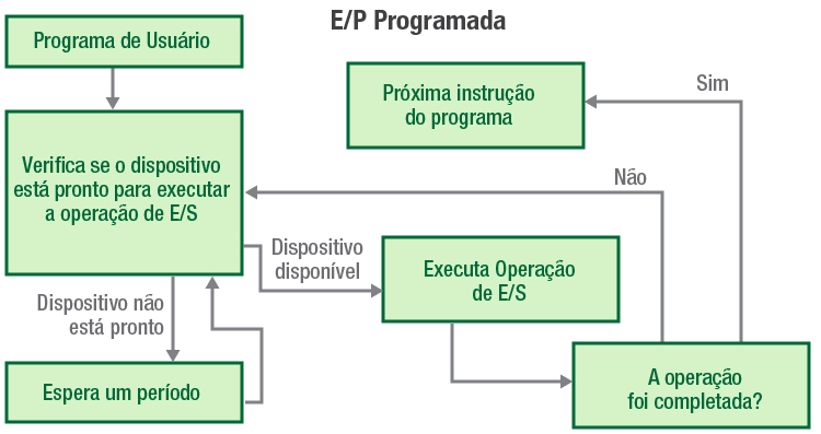 De forma geral, a E/S programada se caracteriza pela facilidade de implementação e baixo custo. Como desvantagem, pode-se citar a ineficiência desta abordagem, sobretudo pelo desperdício de processamento ocasionado pela verificação cíclica da condição do dispositivo. Um esquema de funcionamento da técnica de e/s programada é exibido na figura. |