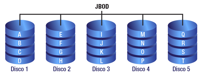 Desta forma, no padrão JBOD, caso um dos discos seja danificado, toda a informação armazenada é perdida. Além disso, não há qualquer preocupação em segmentar a informação e armazena-la em múltiplos discos como forma de melhorar a performance do sistema através do incremento das velocidades de leitura e escrita.