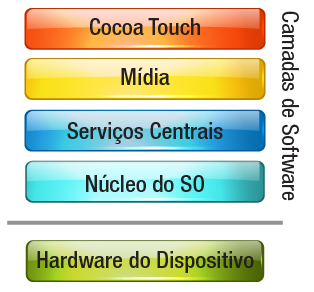 A arquitetura do IOS é segmentada em quatro camadas principais, que atuam como intermediárias na comunicação dos aplicativos de usuário com o hardware do equipamento. A implementação destas camadas pode ser visualizada na figura abaixo.