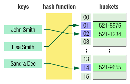 Por exemplo, uma função de hash qualquer utiliza a key de valor “Jonh Smith” como entrada. O hash produzido é o número 02 que servirá como índice para acessar o array. Na referida posição apontada pelo indice (hash) existe o value “521-1234”. Desta forma a key “Jonh Smith” está associada ao value “521-1234" |