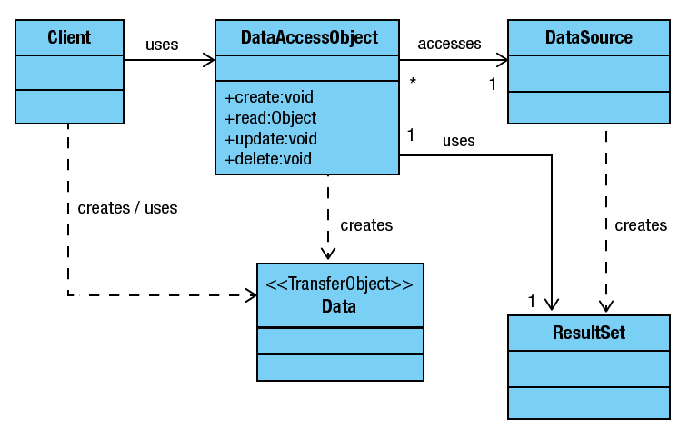 O DataAccessObject é o objeto de função principal desse padrão. Ele abstrai a implementação de acesso a dados subjacente para o cliente a fim de permitir um acesso transparente a fonte de dados. O referido objeto implementa os métodos de criação (insert), consulta (select), atualização (update) e exclusão (delete). Esse conjunto de métodos que permitem a realizam de tais operações são conhecidos pela sigla CRUD (create, retrieve, update e delete).