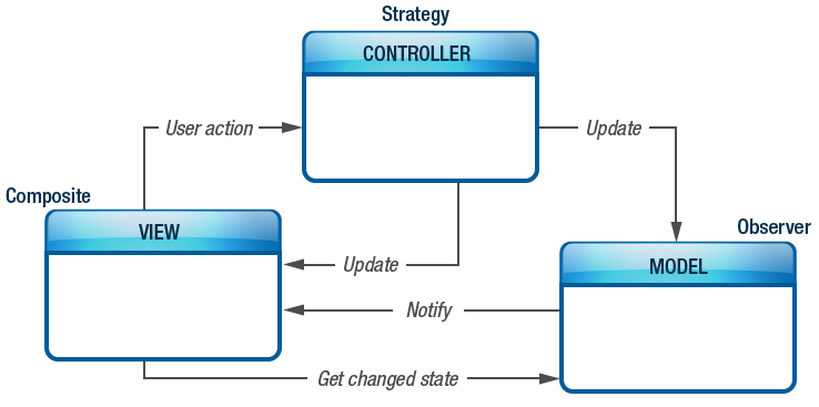 O MVC, além de ser considerado um padrão arquitetural, é também considerado um padrão de projeto híbrido ou complexo ou composto, uma vez que o mesmo se utiliza, basicamente, de três padrões GOF (Observer, Composite e Strategy) harmonicamente interligados. Apesar de outros padrões como o Factory Method, Decorator, Mediator, Command, dentre outros também poderem acrescentar capacidades ao MVC, a essência do MVC está ligada ao relacionamento criado pelos padrões Observer, Composite e Strategy.
