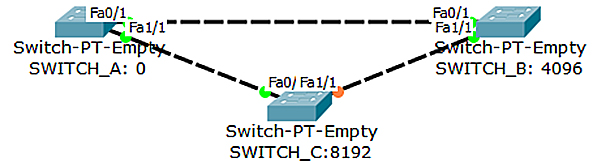 Os números 0, 4096 e 8192 são as prioridades que estão definidas nos equipamentos. Desta forma o Switch A torna-se o switch raiz da rede (root bridge), mesmo que este possua um endereço MAC maior que o Switch B e Switch C.