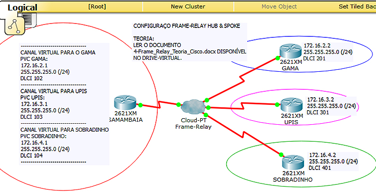 Cenário: conectar 4 sites (filiais) entre si por meio do frame-relay cada filial faz parte de uma sub-rede. Os endereços virtuais (dlci) foram fornecidos pela empresa de telecomunicações.