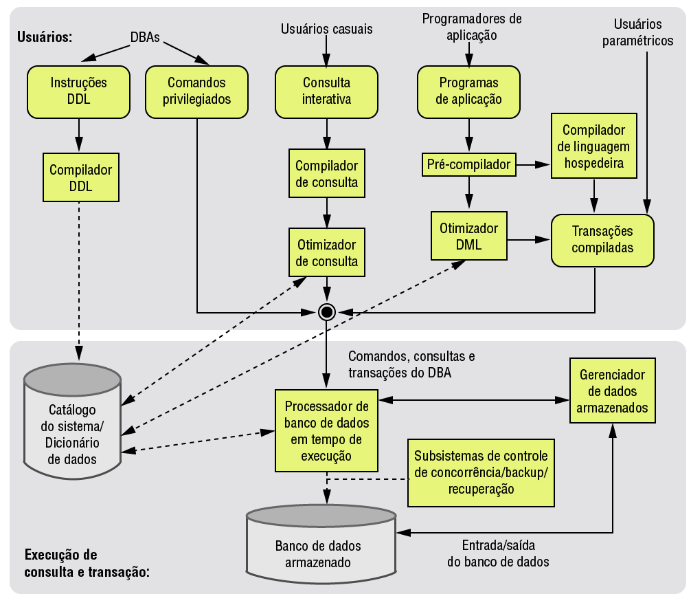 É possível perceber na figura anterior as interfaces para os DBAs, ADs, projetistas e usuários casuais que trabalham com interfaces interativas para formular consultas, programadores de aplicação que criam programas usando algumas linguagens de programação hospedeira, e usuários paramétricos que realizam a entrada dos dados fornecendo parâmetros para transações predefinidas.