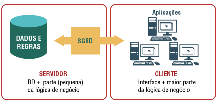 Até há pouco tempo, quando a maioria dos sistemas de informação era instalada nos computadores dos usuários, a arquitetura de desenvolvimento mais comum era a chamada de duas camadas. Nela, uma das camadas representa o SGBD, com os bancos de dados, realizando as operações solicitadas e devolvendo-as aos sistemas de informações que as solicitavam. Na outra camada estavam as estações dos usuários, com os sistemas de informação instalados, apontando suas consultas e operações para os SGBDs. Parte do processamento ocorria no SGBD e outra parte nas estações de trabalho.