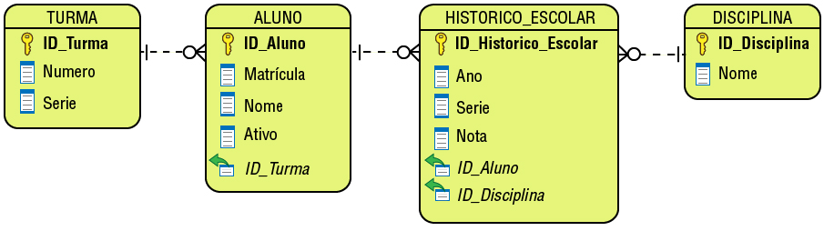 | ID_Aluno | Matrícula | Nome | Ativo | ID_Turma |
