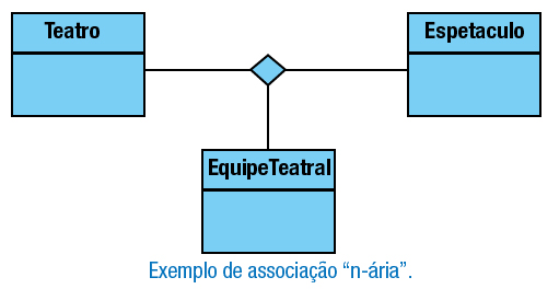 É possível em alguns casos a necessidade de associar mais de duas classes ao mesmo tempo. Esse tipo de associação é chamada de “n-ária”. Para representar uma associação desse tipo, utilizamos um losango para unir as classes associadas.