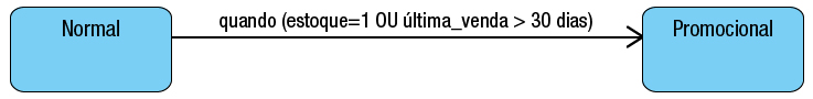 Por exemplo, para modelar a regra de negócio “uma peça deve entrar em estado promocional se o estoque for de apenas 1 ou se ela estiver a mais de 30 dias sem ter sido vendida”, teríamos o diagrama abaixo: