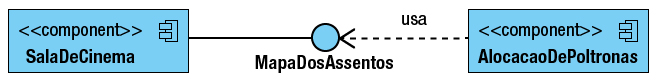 Essa relação de dependência é modelada por meio de uma seta pontilhada que sai do componente e aponta para a interface. O diagrama a seguir ilustra que o componente “AlocaçãoDePoltronas” não funcionará ao menos que ele possa acessar o componente “SalaDeCinema” por meio da interface “MapaDosAssentos”.