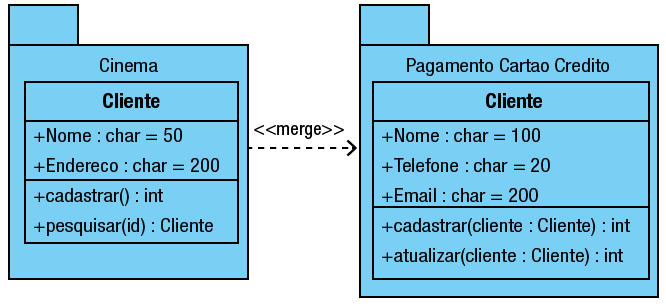 A relação de mesclagem entre dois pacotes é desenhada como uma seta pontilhada, apontando para o pacote de origem. Sobre a seta insere-se o estereótipo <<merge>>.