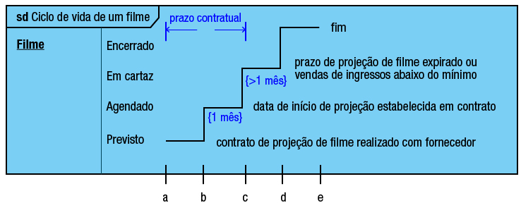 Na próxima figura, a restrição de duração indica que o tempo entre a assinatura do contrato de locação do filme e o agendamento para que ele entre em cartaz é de um prazo definido em contrato (“prazo contratual”).
